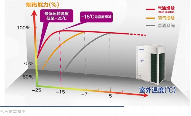 通過抽取部分中間的壓力冷媒,將主循環(huán)冷媒進(jìn)行過冷卻提高效率的同時(shí),顯著增加了壓縮機(jī)的排氣量,也有效抑制了排氣溫度過高,使系統(tǒng)在寒冷氣候下提升制熱能力,在制冷時(shí)亦可增加冷媒量。并自動(dòng)調(diào)節(jié)壓縮機(jī)頻率,有效提升系統(tǒng)滿負(fù)荷及超低負(fù)荷工況下的系統(tǒng)效率體驗(yàn)出色的熱力效果。