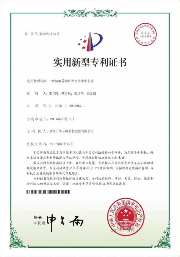 環保裝飾貼面板經國家人造板質量監督檢驗中心等權威機構檢測,莫干山研發的環保板的甲醛釋放量達到了歐洲環保標準E1級和日本F2級,而且在膠合強度和耐老化性能方面也得到了極大提高。2001年,莫干山板材拿到了貼面板行業的首張“綠色環境標志認證”。