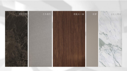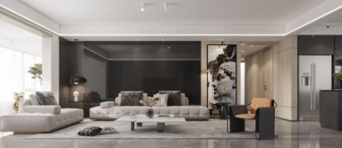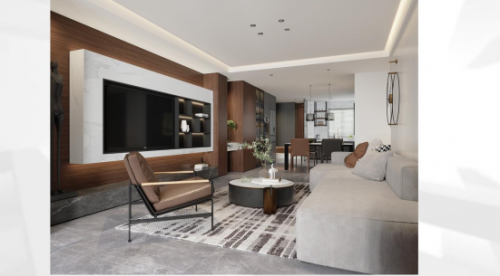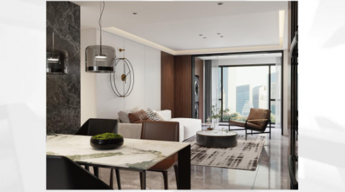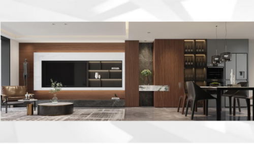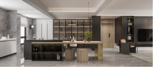 客廳作為公共區域的空間,現代棕色的木飾面與淺灰色系的柜門、大面積的墻面及吊頂白色空間交相呼應;與帶有石材紋理的臺面、地面共同營造出獨特的高級感,與傾斜進客廳的日光一同,成就家中的優雅精致。