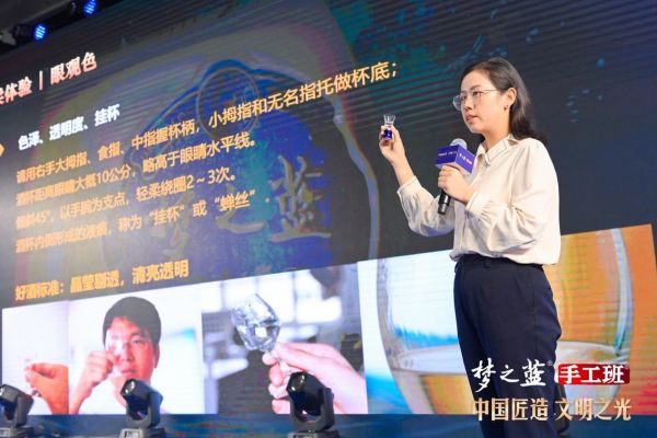 洋河大師工作室,全國(guó)品酒師大賽冠軍田銳花上臺(tái)夢(mèng)之藍(lán)·手工班做演講推介。七個(gè)字總結(jié)它的特點(diǎn):尊貴、稀缺、更好喝。尊貴取決于三個(gè)因素。第一個(gè)因素是“老窖”,手工班全部出自夢(mèng)之藍(lán)中央酒區(qū)的百年明清老窖。俗話(huà)說(shuō):千年老窖萬(wàn)年糟,酒好全憑窖池老。第二個(gè)因素是老酒,手工班選用的都是20年以上的老酒作為基酒。酒體經(jīng)過(guò)20年的自然老熟,更平衡、更綿柔、更飽滿(mǎn)。第三個(gè)因素是“老匠人”。手工班在傳統(tǒng)三低工藝的基礎(chǔ)上,采用的是非遺手釀技藝。每一滴酒體都需要經(jīng)歷137道手工工藝。明清老窖產(chǎn)的原酒經(jīng)過(guò)層層篩選、優(yōu)中取優(yōu)只有15%才能符合手工班的品質(zhì)要求。20年以上的特級(jí)老酒,20年的修煉雕琢,20年以上老匠人的精心打造,使得手工班喝起來(lái)更加醇厚、細(xì)膩、綿長(zhǎng)。