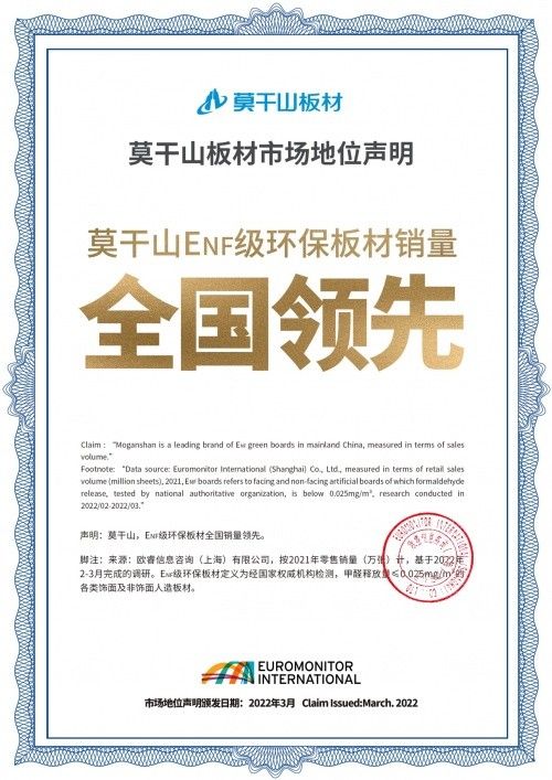 2021年11月,通過初始工廠檢查、市場(chǎng)隨機(jī)抽樣檢測(cè)和獲證后監(jiān)督的模式,依據(jù)《無(wú)醛人造板及其制品甲醛釋放量分級(jí)認(rèn)證技術(shù)規(guī)范》,國(guó)建聯(lián)信對(duì)豆茵板的芯板、中板和單板基材以及大豆蛋白膠粘劑進(jìn)行了甲醛釋放量的全面檢測(cè),檢測(cè)結(jié)果表明豆茵板達(dá)到了甲醛釋放量≤0.025mg/m3的ENF級(jí)環(huán)保標(biāo)準(zhǔn)要求,并頒發(fā)了無(wú)醛人造板分級(jí)認(rèn)證證書,準(zhǔn)許豆茵板使用ENF分級(jí)認(rèn)證標(biāo)志。莫干山板材也成為行業(yè)首批獲得該證書的企業(yè)。