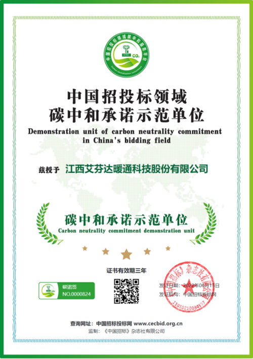 實現2030年“碳達峰”及2060年“碳中和”的宏偉目標,是我國向世界作出的莊嚴承諾,也是一場廣泛而深刻的經濟社會變革。為響應國家戰略政策,踐行碳中和助力綠色發展,艾芬達積極申報工信部中國招標投標網開展的“碳中和承諾示范單位”征集。
