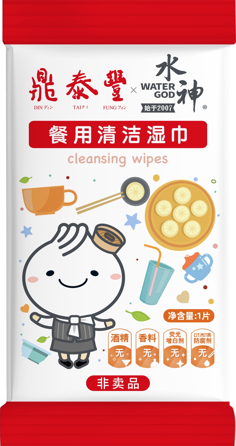 專為鼎泰豐研發(fā)設計的鼎泰豐&水神聯(lián)名款餐用清潔濕巾已于2022年3月上新,獨立單片裝設計,隨用隨拆,干凈衛(wèi)生。無熒光增白劑、無CIT/MIT類防腐劑、無酒精、無香精,安全不刺激,而且用完不留味道。飯前擦餐具、飯后擦嘴,觸感溫潤,帶給顧客柔和的親膚體驗!