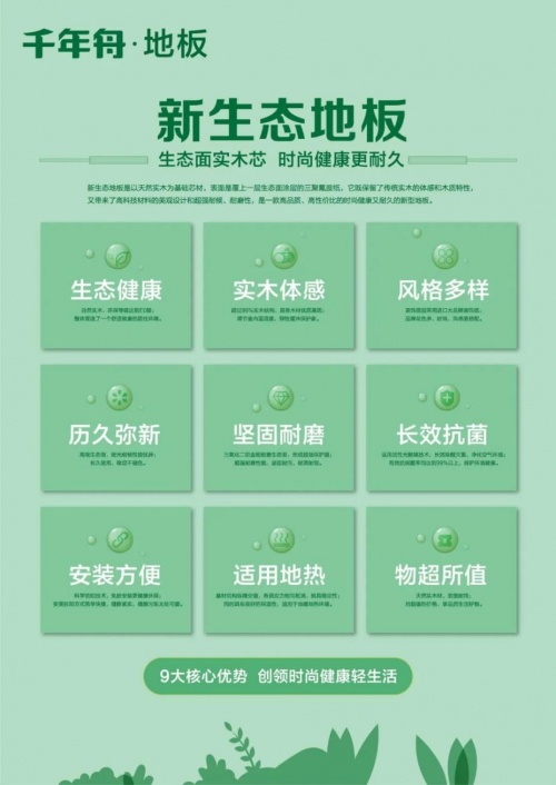 千年舟新生態(tài)地板,是以天然實木為基礎芯材,表面是覆上一層生態(tài)面涂層的三聚氰胺紙,它保留了傳統(tǒng)實木的體感和木質特性的同時,還帶來了高科技材料的美觀設計和超強耐候、耐磨性,是一款高品質、高性價比的時尚健康又耐久的新型地板。千年新生態(tài)地板以其全新九大核心優(yōu)勢,創(chuàng)領時尚健康輕生活!