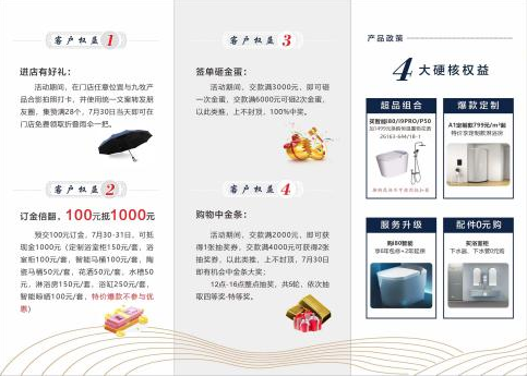 為回饋忠實消費者,此次九牧湖南技術體驗中心店開業活動,不僅有爆款、優質新品及保價全年的活動力度,顧客進店即享4重權益:
