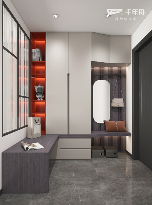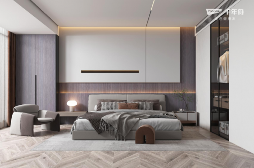 隱藏式燈帶層板和雁行意木墻板結合,打造高級質感,簡潔的色調顯得更為平衡統一,詮釋著平和淡雅的心境。