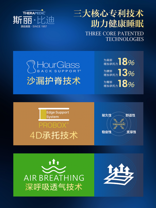 斯麗比迪擁有Hour Glass? 沙漏護脊技術 、AirBreathing深呼吸透氣技術、SuperPROBOX? 4D承托技術,三大全球核心技術和強大的睡眠研究中心所極力打造的床墊,致力為中國消費者構筑獨有的恢復性睡眠,重新定義健康睡眠的涵意。
