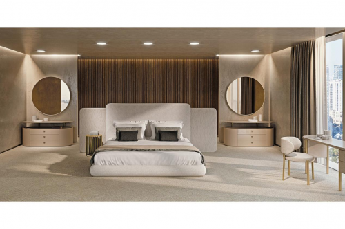 ROMA臥室系列可謂對“圓融”演繹到了極致,弧線感非常強。床由翼形結構制成,覆蓋柔和的毛圈織物;烤漆木質臺面加金屬腿的組合讓梳妝臺更具裝飾感;寫滿現代印記的床頭柜、斗柜不僅實用,更能隨時成為空間的風景。