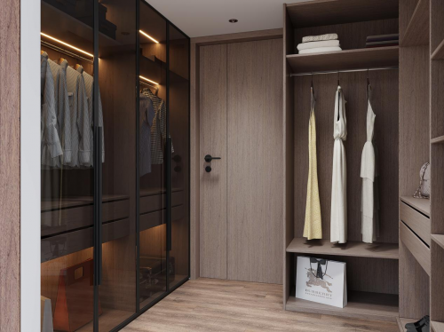 衣帽間——咖色柜體與茶色玻璃的完美契合,智能燈光的加入,讓空間中的色彩與溫度停留在剛好的位置。充分考慮到生活需求的柜體隔間設計,功能豐富的衣帽柜,讓這個空間擁抱更強大的收納空間。