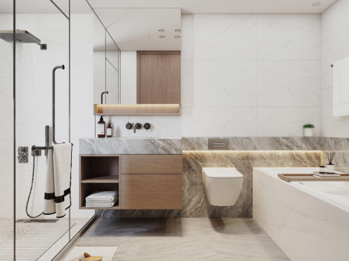 衛生間——兼具防水性能與高穩定性的柜體,用淺咖木色增強浴室空間的整體溫度,讓冷白的浴室內有了一抹暖色。分類收納儲物功能,進一步起到優化空間的效果,令整體格局更合理清晰,顏值與功能兼具。