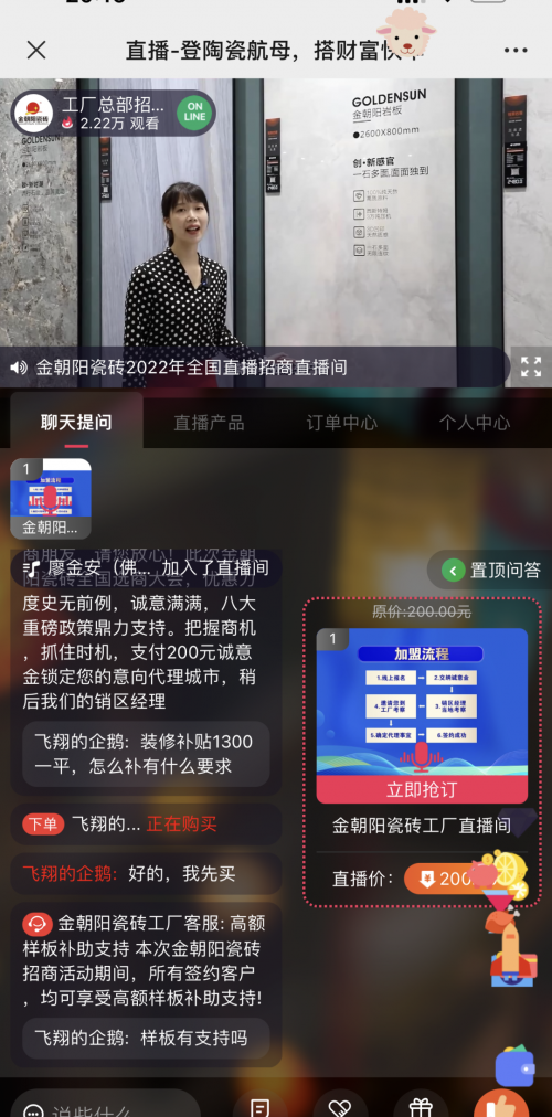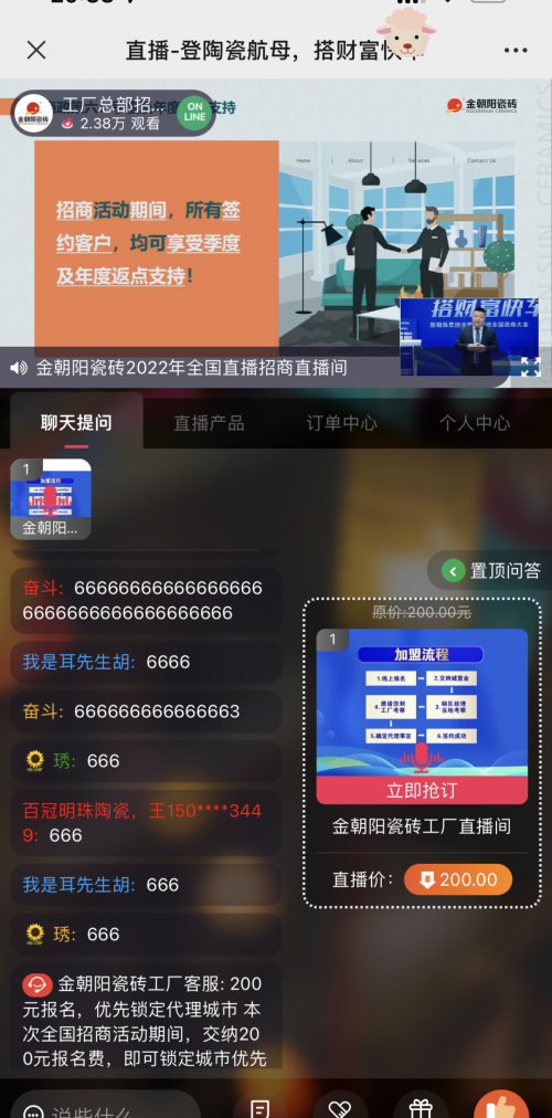 本次直播最引人關(guān)注的環(huán)節(jié),由金朝陽品牌副總經(jīng)理鄭凱給在直播間的意向客戶帶來了重磅的招商政策以及建店幫扶支持,招商期間支付200元誠意金搶六大招商特權(quán)以及優(yōu)先鎖定空白城市席位的直播間專屬福利,全方位扶持經(jīng)銷商,給意向經(jīng)銷商注入強大的信心和動力。