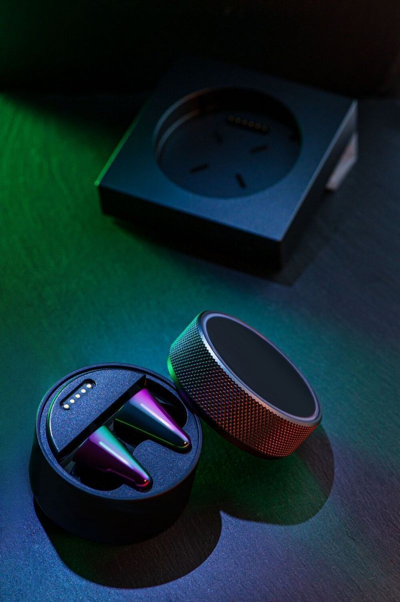 其中作為主打色的「義體黑」,其充電盒采用陽極氧化工藝、上蓋也使用了滾花工藝處理來提升觀感與手感。耳機本體采用了炫彩漸變色作為基調,將賽博朋克風格融于設計之中。