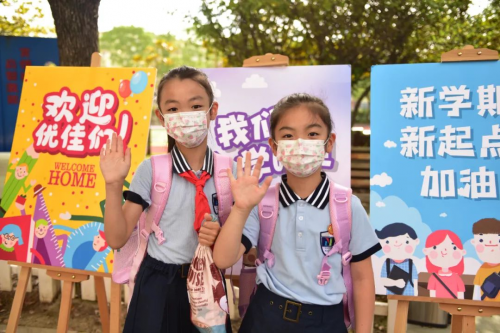 長寧區綠苑小學的“姐妹花”和老師們招手,久別重逢之后,告別了疫情的陰霾,學生對新學期充滿了希望,校園里也因此充滿了活力。