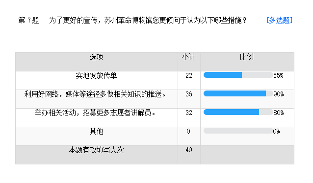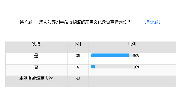 絕大多數(shù)調(diào)查對象都認(rèn)為蘇州革命博物館的紅色文化已經(jīng)宣傳到位,但是仍有少部分的人持反對意見。蘇州革命博物館在宣傳方面還有很多的路要走 。
