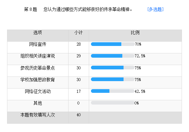 通過此次問卷調(diào)查與數(shù)據(jù)分析,我們不得不感嘆:當(dāng)代人對于黨史方面的學(xué)習(xí)太少,但是一個民族要走在時代前列,就一刻不能沒有理論思維,一刻不能沒有正確思想指引。偉大精神跨越時空,在百年黨史中熠熠生輝。在感悟偉大精神、學(xué)習(xí)百年黨史中,紅色文化、紅色資源作為關(guān)鍵要素,發(fā)揮著重要的引領(lǐng)和載體作用。紅色文化凝結(jié)著偉大創(chuàng)造精神、偉大奮斗精神、偉大團結(jié)精神、偉大夢想精神,是屬于全黨、全國各族人民的先進文化。紅色資源是紅色文化的鮮活載體,蘊含深刻的思想內(nèi)涵,承載著黨史、新中國史、改革開放史、社會主義發(fā)展史,是我們黨艱辛而輝煌奮斗歷程的見證,是最寶貴的精神財富。新時期,黨史職能部門應(yīng)當(dāng)主動擔(dān)當(dāng)作為,以學(xué)習(xí)、弘揚、傳承紅色文化為己任,保護好、管理好、運用好紅色資源。