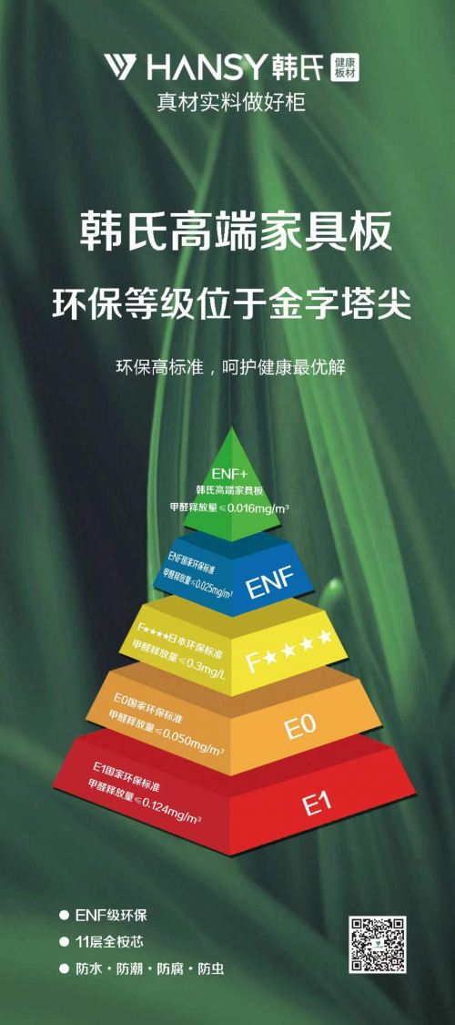 環(huán)保、創(chuàng)新為引,成立近30年來,韓氏始終不忘初心,秉承人性化發(fā)展戰(zhàn)略,為行業(yè)樹立先進的環(huán)保發(fā)展標桿形象,為碳中和目標貢獻獨特的力量。近年來,板材環(huán)保標準層層升級,進入ENF級時代。韓氏緊跟趨勢,推出多款除菌低醛板材新品,通過權威機構認可,打造綠色清爽的人居環(huán)境。