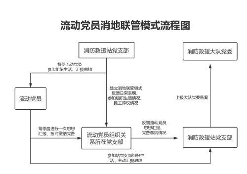 一是以聯(lián)管模式為“把控點”,促流動黨員“收心”。建立流動黨員消防地聯(lián)管模式,基層隊站黨支部主動與流動黨員組織關(guān)系所在黨支部建立聯(lián)系,隊站黨支部通報流動黨員日常表現(xiàn)、參加組織生活和民主評議情況,流動黨員組織關(guān)系所在黨支部反饋流動黨員思想?yún)R報和交納黨費情況,流動黨員不僅要參加隊站黨支部組織的活動,還要定期向組織關(guān)系所在黨支部進(jìn)行思想?yún)R報,每月交納黨費。通過消地聯(lián)管模式,進(jìn)一步強化了流動黨員組織觀念和組織意識。