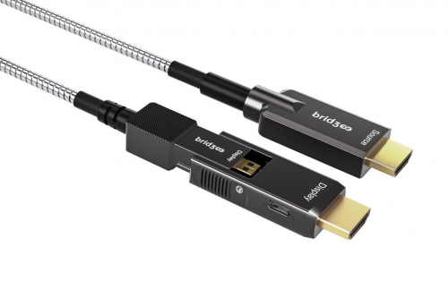 此次橋連無界?(bridgee)亮相分離式HDMI鋼甲光纖線——“PROF-H18DK”,一線解決集成商頭痛的布線穿管難題。產品具有堅固耐用和易穿管兩大優勢,采用304不銹鋼線纜護甲和單端分離式插頭,專門攻克集成商施工項目中穿管困難、線纜破損、信號不通的難題。且最長可達100米,滿足影院系統、視頻會議、租賃舞臺、仿真投影等各種大場景使用,