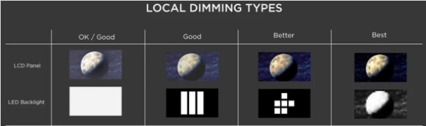 以目前市面上主流的75英寸電視為例,背光分區(qū)數(shù)可以分為幾十級(jí)、百級(jí)、三百級(jí)、兩千級(jí)、五千級(jí),以及八千級(jí),不同的數(shù)量帶來(lái)的是不同對(duì)比度的變化。
