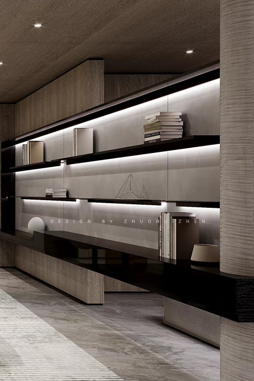 木石相依,材質(zhì)運(yùn)用與整體空間融為一體,收納、美學(xué)展陳、閱讀功能在此處依次巧妙融合。