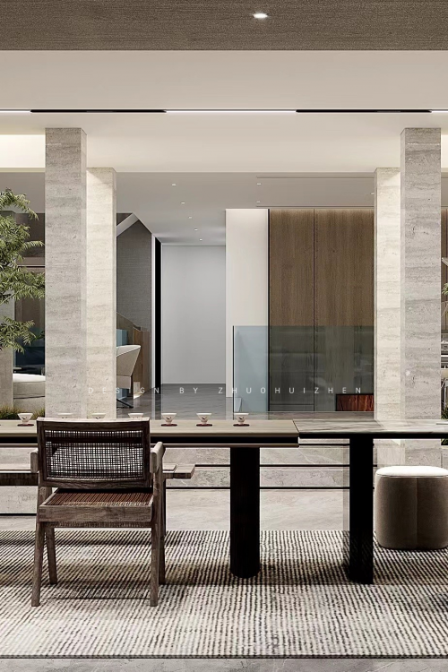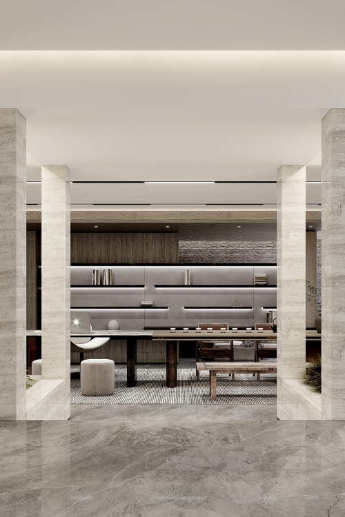 過(guò)廊透過(guò)盡頭的天井巧妙引入自然光。大理石材質(zhì)是這一區(qū)域的材質(zhì)基底,與原木材質(zhì)、自然光交織,帶來(lái)清簡(jiǎn)、禪意的氛圍。