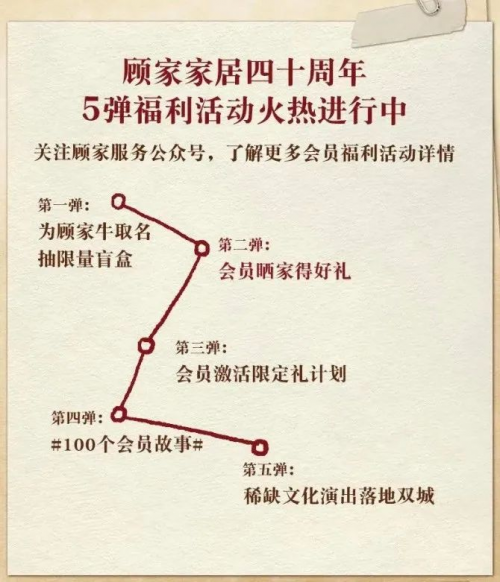 顯然,顧家家居抓住了這一發展趨勢,消費群體正逐漸擴大。時值品牌40周年,顧家家居線上線下的寵粉活動也在持續加碼。線上方面,顧家家居為用戶持續帶來“寵粉福利”,如尋找顧家老用戶,陪伴時長前100位用戶獲贈顧家按摩椅,以真實回饋感恩老用戶的陪伴;再比如,陸續開展了“抽限量盲盒”、“曬家得好禮”、“會員激活限定禮”、“100個會員故事”等放利活動,以新奇有趣的活動,接連解鎖“花式寵粉”驚喜。