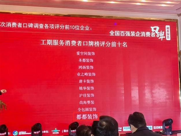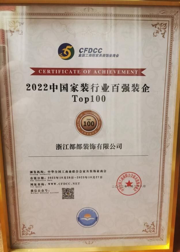 今年10月末,在由全國工商聯家具裝飾業商會主辦的“2022中國家裝百強榜”上,都都裝飾從設計服務、施工服務、材料服務、工期服務、工地現場管理、環保服務、零增項服務等七個方面的脫穎而出,以絕對優勢登上“2022中國家裝行業百強榜”及“工期服務消費者口碑十強榜”兩個榜單,這不僅體現出都都裝飾強大的綜合實力、口碑和家裝影響力,也代表了業內對都都裝飾實力的認可,和客戶對都都的信任與支持。