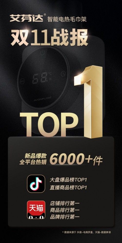 一年一度的雙11狂歡購(gòu)物節(jié)已經(jīng)落下帷幕,各大行業(yè)榜單排名備受關(guān)注。在智能電熱毛巾架類目中,艾芬達(dá)斬獲天貓抖音雙平臺(tái)第一。