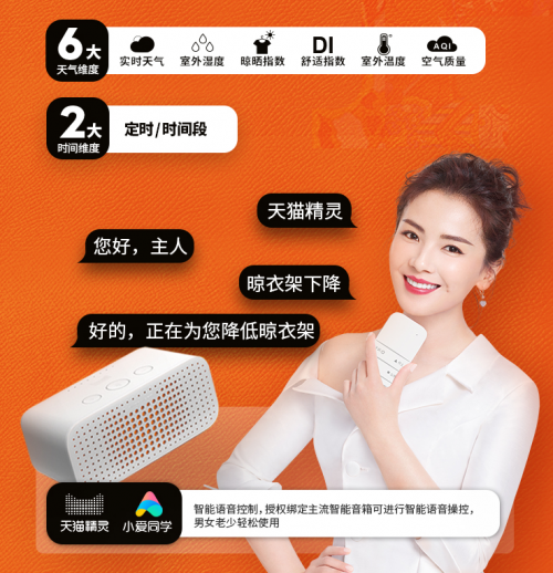 而智能操控技術的運用,更是讓晾衣機得到了前所未有的關注。連接APP隨心掌控、智能語音控制,產品人性化到不可置信:知日夜、懂天氣、懂人語、懂人心、能溝通、會交流,天貓精靈隨時聽候主人調令,讓黑科技產品提前便捷生活,提升生活質量,拉高生活調性,無限增大幸福指數。