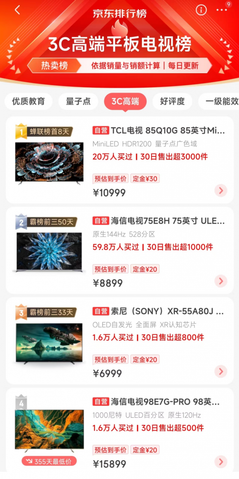 這不馬上雙12了嘛,老家的電視也十多年了,想給家里也換一個(gè),85英寸或者75英寸的就行,結(jié)果發(fā)現(xiàn)又?jǐn)嘭浟耍@是要“蟬聯(lián)斷貨王”嘛……不過這次我學(xué)聰明了????,先付定金排隊(duì)等發(fā)貨,當(dāng)然我也找了幾個(gè)家電銷售朋友打聽了一下,好家伙,這次是全渠道斷貨,不過好在TCL有華星廣電和成熟的產(chǎn)業(yè)鏈做倚杖,Q10G的補(bǔ)貨速度還是很快的,安心等待就好。