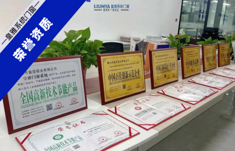 皇雅系統門窗榮獲多項榮譽證書,廣東省門窗協會副會長單位,中國十大系統門窗門窗品牌,曾獲中國十大家裝門窗品牌,中國百佳創新示范企業、中國門窗系統行業十大品牌、中國門窗系統十佳企業、中國馳名品牌、全國高新技術節能產品、質量、服務AAA級品牌。