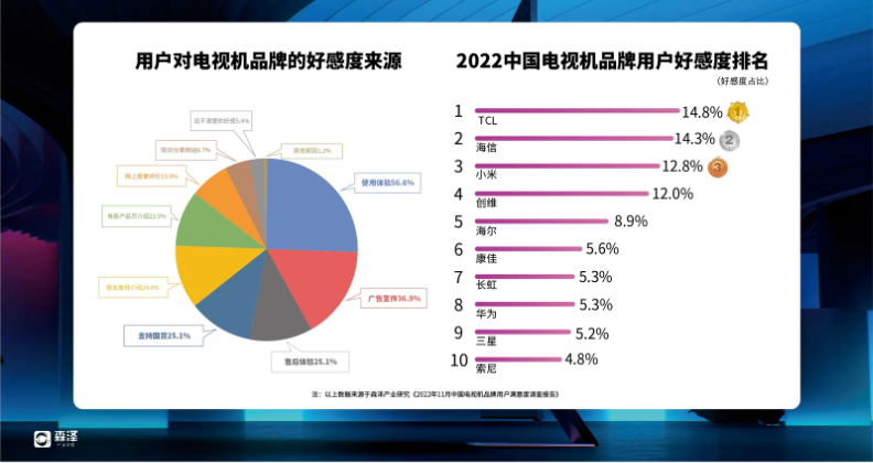 排名前五的品牌依次為:TCL、海信、小米、創(chuàng)維、海爾,其中14.8%的用戶表示對TCL好感度最高,在用戶好感度排名中位列第一,之后依次是海信14.3%、小米12.8%、創(chuàng)維12.0%、海爾8.9%等等。前三大品牌的好感度來源主要集中在自身對該品牌產(chǎn)品的使用體驗(yàn)、品牌的廣告宣傳,以及良好的購買售后體驗(yàn)等。
