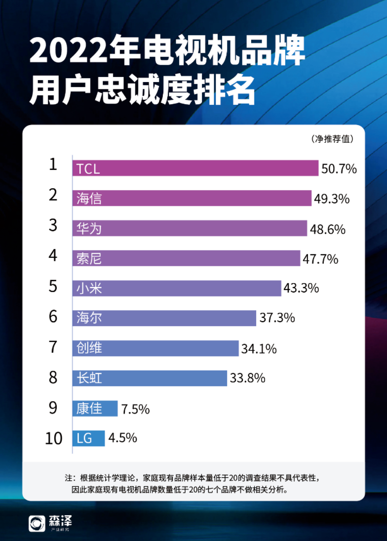 但本次調(diào)查報(bào)告在用戶忠誠度方面,TCL的表現(xiàn)卻“扭轉(zhuǎn)”了電視的常規(guī)消費(fèi)習(xí)慣,在TCL用戶認(rèn)可的口碑維度,前三位是畫質(zhì)、音質(zhì)和售后保障,也就是說TCL的用戶會(huì)在使用過產(chǎn)品后,因?yàn)槠涑錾漠a(chǎn)品體驗(yàn),而更愿意再次購買,并更多推薦給其他人。綜合下來,TCL品牌的用戶凈推薦值達(dá)到50.7%,位列第一,也是唯一超過50%的品牌。往后依次是海信49.3%、華為48.6%、索尼47.7%、小米43.3%。