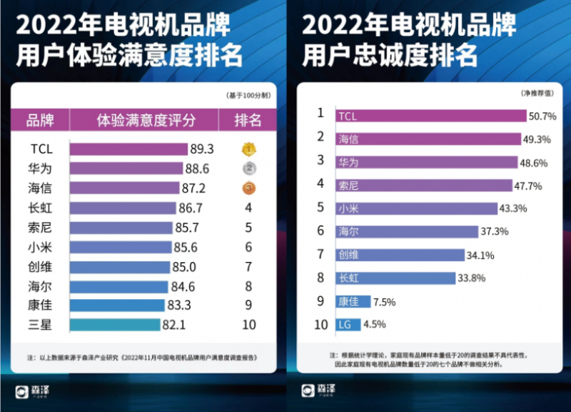 近日,國內知名產業研究調研機構森澤公布了《2022年中國電視品牌用戶滿意度調查報告》,該報告從品牌認知、使用體驗、消費習慣等多個方面對當下電視消費市場進行了全面調查,總結歸納消費者關于電視機的使用體驗、NPS凈推薦值以及影響消費者對電視機的購買選擇影響因素、品牌好感度及形成原因等。