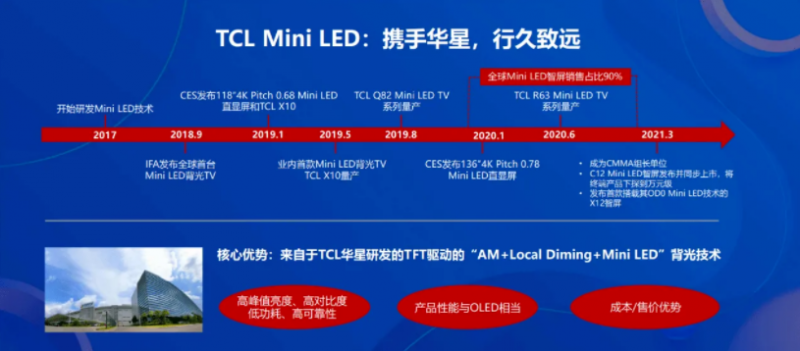 創新求變,科技護航,早在2009年TCL便投資了華星光電,開始面板核心技術的研發,經過十三年的發展積淀后者已成為國內唯一一家能自主生產屏幕面板的電視品牌;同時TCL也加速發展自研技術,在業內率先開啟Mini LED的技術研發,2019年成功量產,驚艷世界;2020年TCL Mini LED產品全球銷售占比高達90%。