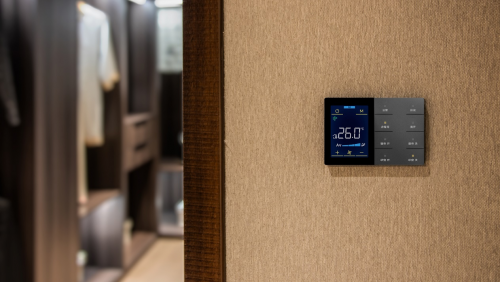未萊KNX智能三合一溫控面板,提供空調、新風、地暖三大功能和多種模式選擇,可靈活設置接近感應功能,手勢或靠近時喚醒屏幕,方便用戶快速鎖定和使用功能,體驗更加自然流暢。