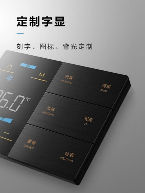 智能場景面板可提供4/6/8位按鍵,支持自定義場景模式,融合照明控制、窗簾控制和場景控制功能;按鍵支持刻字、圖標、背光定制,可以適應多樣化的居家需求,享受專屬智能家居生活。