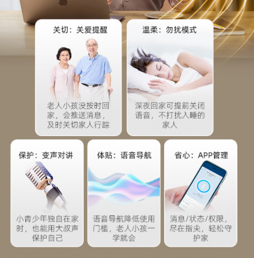 好太太品牌一直再向體驗式智能家居引領(lǐng)者所努力,從這款V86S的特色功能就能窺見一二。該款產(chǎn)品提供關(guān)愛提醒(老人小孩未按時回家)、勿擾模式(深夜回家關(guān)閉語音)、變聲保護、語音導(dǎo)航、APP管理共五種家庭關(guān)懷設(shè)計。尤其是變聲保護功能,小朋友或者單身女性單獨在家時,可以用大叔聲音來保護自己。