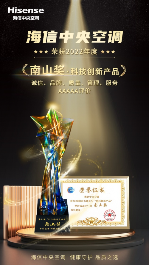 在此方面,海信中央空調一直專注于為守護國民健康呼吸和美好生活帶來空氣解決方案,不斷斬獲來自市場消費者與行業的認可。12月28日,憑借在室內空凈領域的技術創新和健康凈化能力,海信中央空調獲得“南山獎”的認可,再度榮登“南山獎”榜單。值得一提的是,這已是海信中央空調三度榮獲“南山獎”,以硬核實力印證國貨之光名副其實。