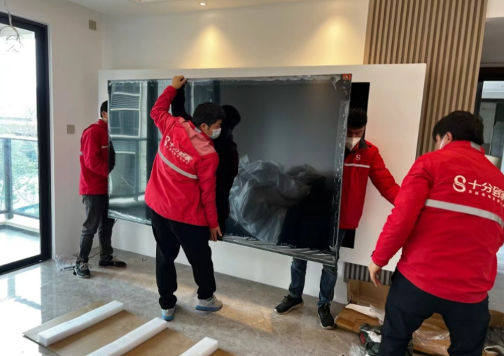 實際安裝過程也確實如此,從門崗到我家單元門口300米的路程,師傅們用小推車小心翼翼的走了有10分鐘時間,一路上他們精心呵護(hù),避免磕碰剮蹭,非常用心。隨后,電視也順利進(jìn)入電梯,來到我家客廳。