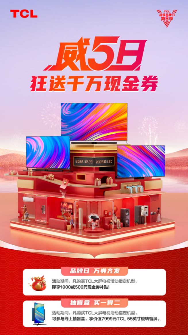 哦對了,春節(jié)快到了,如果想在過年前換電視的,現(xiàn)在正好有TCL 的“威5日”大促活動,1月20日前購指定機型就可參與線上抽盲盒,中獎率100%,說不定還有機會抱走一臺價值7999元的TCL旋轉智屏回家了,另外還有品牌日萬券齊發(fā)、購TCL指定大屏享1000元現(xiàn)金券等優(yōu)惠,比我當時買還劃算,感興趣的抓緊去看看哈。