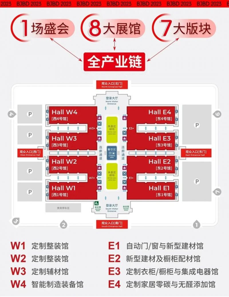 北京建博會投入8大展館,12萬平方米,分成定制整裝、定制輔材、智能制造裝備、自動門窗與新型建材、新型建材及櫥柜配材、定制衣柜櫥柜與集成電器、定制家居零碳與無醛添加等七大板塊,實現產業鏈上中下游的整合。