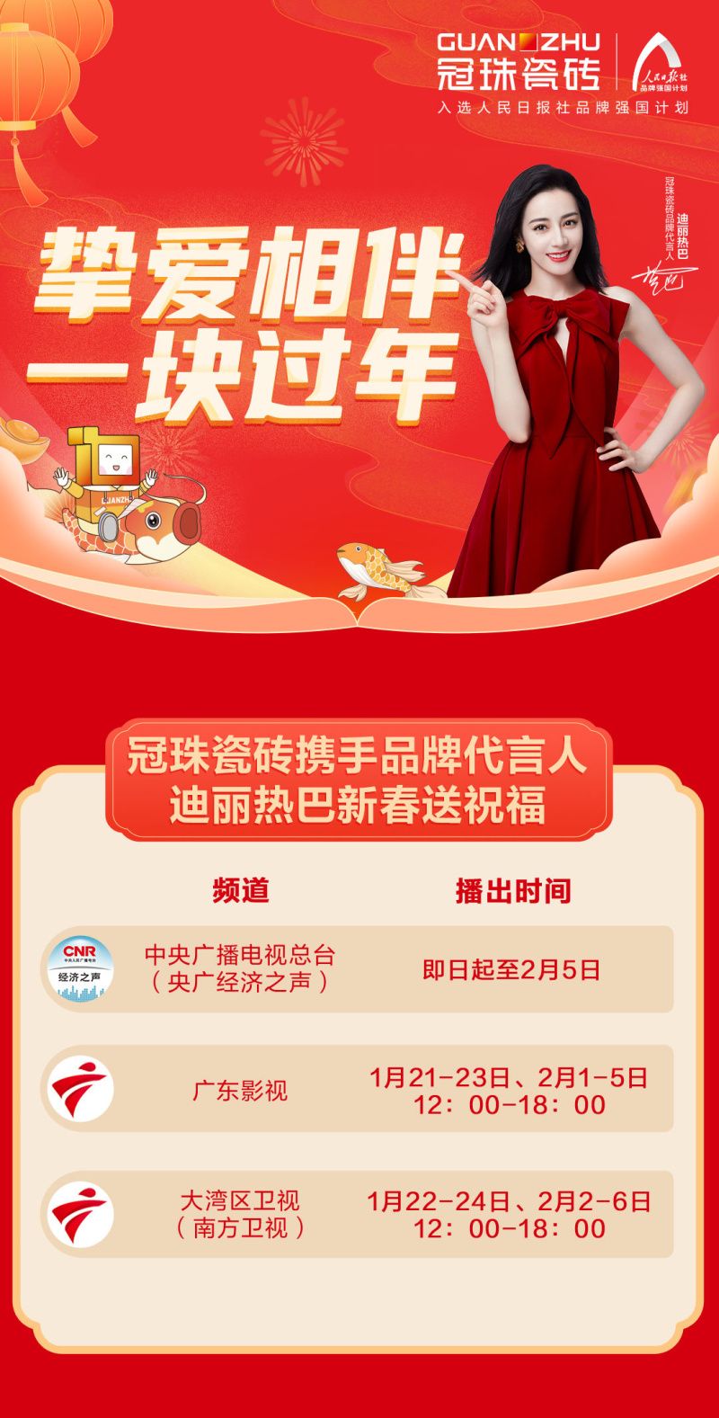冠珠瓷磚不僅在“幸福列車與南方航空”上暖心相伴,還攜手品牌代言人迪麗熱巴,在春節(jié)期間以美好的祝福登陸中央廣播電臺(tái)與廣東/南方衛(wèi)視,愿大家新年快樂、事事順利!
