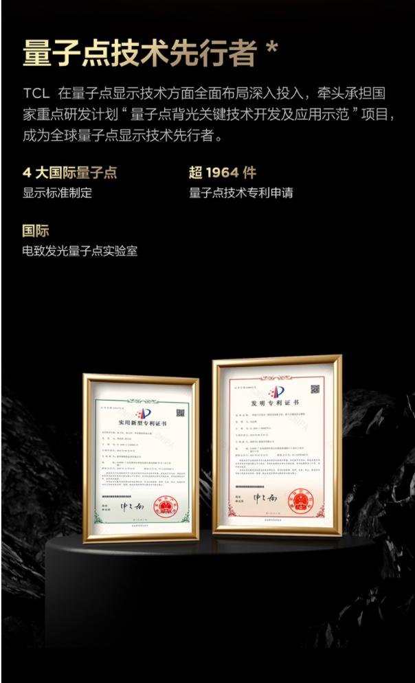 TCL C11G有如此亮眼的產品力表現,背后還是離不開TCL強大的技術研發實力。以其核心的量子點技術為例,TCL在量子點顯示技術方面全面布局深入投入,牽頭承擔國家重點研發計劃“量子點背光關鍵技術開發及應用示范”項目,成為全球量子點顯示技術先行者,進而實現在產品終端的完美落地應用。