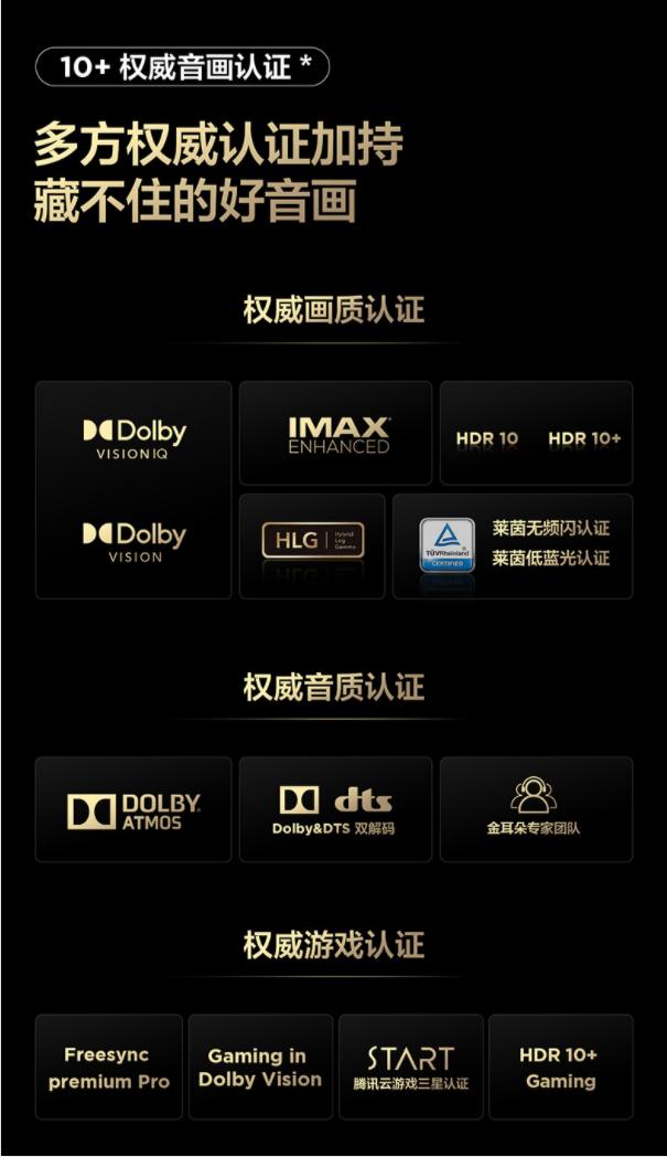 此外,TCL C11G還搭載了Dolby Vision IQ、萊茵低藍光認證、萊茵無頻閃認證等認證,在保證畫質色彩的同時有效做到護眼效果;音效方面搭配了安橋2.1 Hi-Fi音響,支持垂直AI聲場+空間自適應,讓影音質感的表達也有了保障。