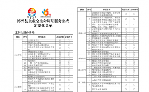創新“智能化”場景,家族式集成套餐。精準對接企業和個人需求,在“一窗受理”“一業一證”“一次辦好”改革成果的基礎上,圍繞企業開辦、生產經營、清算注銷等事項的全生命周期服務鏈,推動多個跨部門政務服務事項集成化辦理,對企業全生命周期涉及的15個固定場景、177個事項,提供主題式、套餐式服務。線下,企業通過“博興縣企業全生命周期服務集成定制化清單”,自由選擇、組合式辦理業務;線上,通過“博興縣企業全生命周期服務平臺”,跨場景選擇所需服務,系統動態集成“一件事”,實現“一張表單、一套材料、一次申請”的“動態場景式并聯服務”。通過流程再造,許可環節平均壓減60%,申報材料壓減65%,審批用時平均縮短70%以上,極大提高了審批效率。