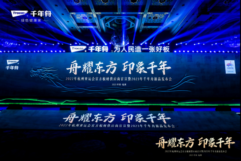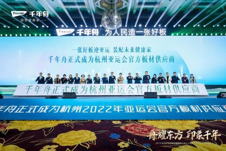 活動現場,在政府領導、協會專家、同行代表、合作伙伴、媒體代表等共計1000余人的共同見證下,千年舟牽手亞運,正式官宣“杭州亞運會官方板材供應商”身份,開局就掀起高潮。