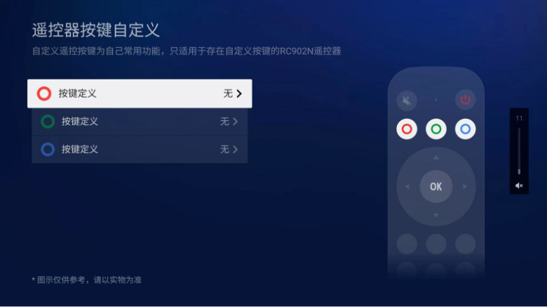 針對這個問題,TCL在遙控器上做了優化,貼心地增加了紅綠藍三種顏色的快捷鍵,設置后一鍵開啟應用,有些像iOS里的快捷指令,對老人和小孩來說這種操作會更簡單便捷。