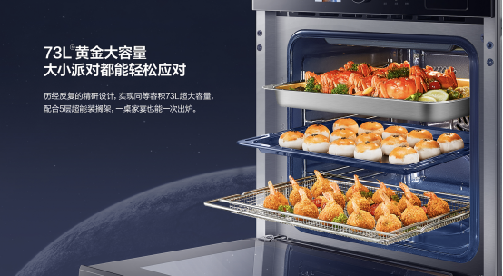 當下人們對生活的態度是,既要便捷又要精彩,人們希望能與親朋好友一起在家中歡聚,又不希望在烹飪上花費太多時間。老板旋轉蒸烤炸一體機CQ925搭載行業領先的73L盛宴級容量,上中下共5層擱架超能裝,一層可烤12個蛋撻、15個雞翅、2個蒸菜、10寸披薩,一次可同時蒸/烤多層,大幅提升烹飪效率。下廚不會做?沒關系!系統內置了58到自動菜譜,一鍵即可get南北招牌菜肴,配備3.5英寸彩屏,結合實體旋鈕,操作簡便體驗感更好。