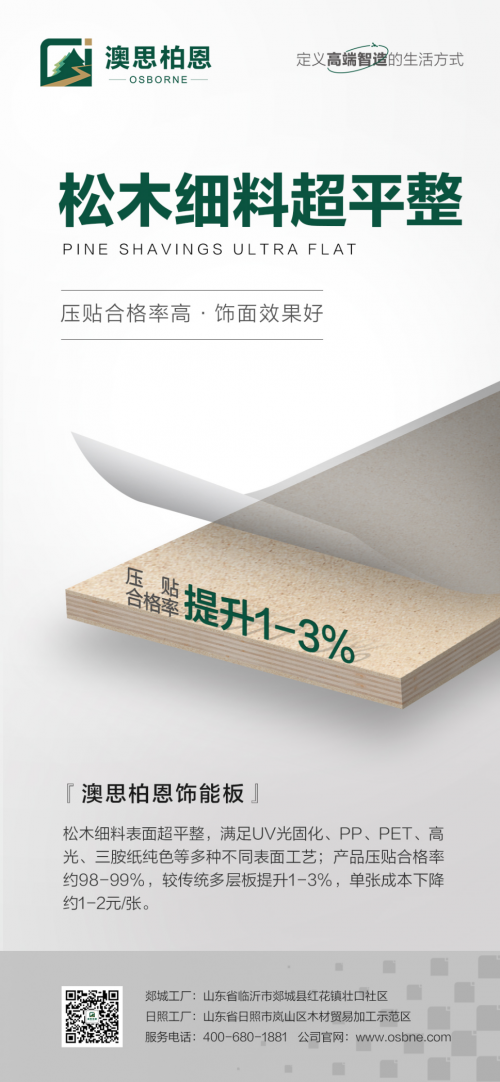 不同于傳統(tǒng)多層板表面貼科技木皮,飾能板表面鋪裝細料刨花高能聚合能有效提升板材表面平整度(厚度偏差0.15mm),能有效提升板材封邊效率;滿足UV光固化、PP、PET、高光、三胺紙純色等多種不同表面工藝。